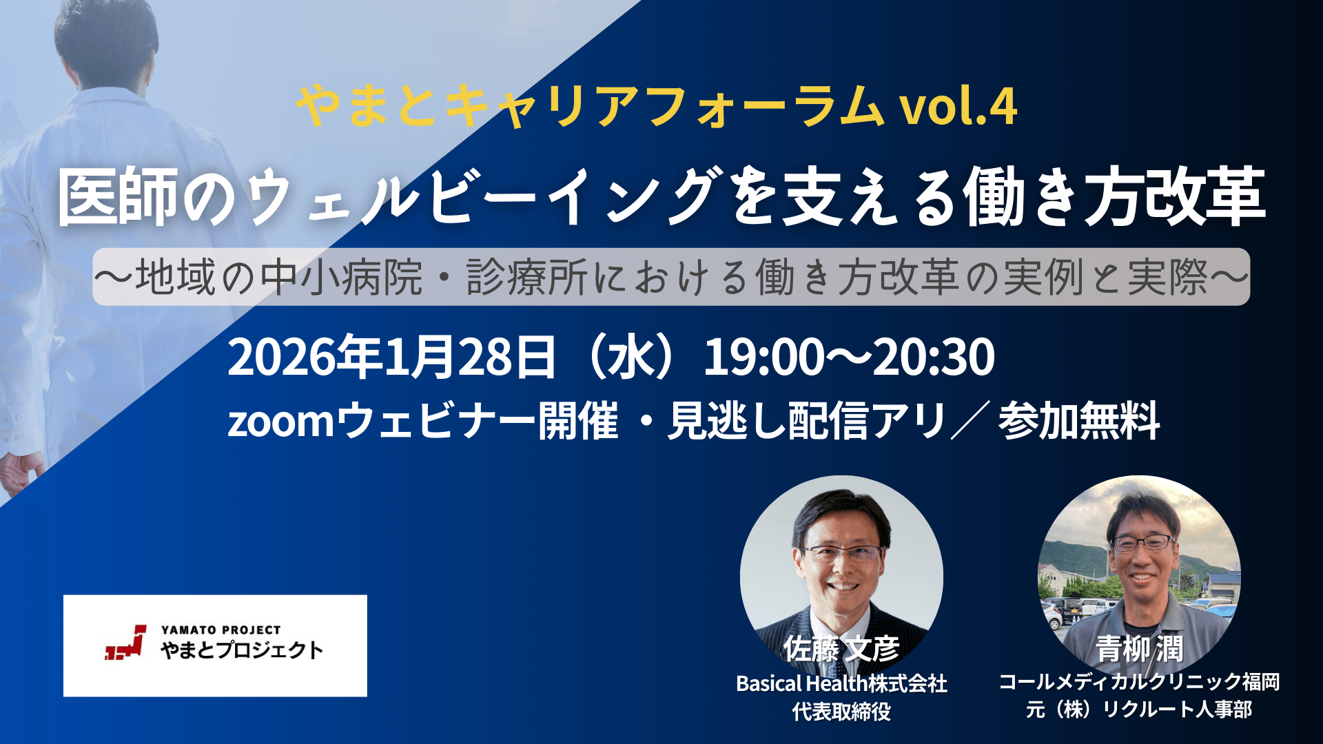 更新日:2025.12.262026/1/28(水)開催の「やまとキャリアフォーラム」vol.4、テーマは「医師のウェルビーイングを支える働き方改革 ~地域の中小病院・診療所における働き方改革の実例と実際~」です。詳しくはリンク先をご覧ください。
