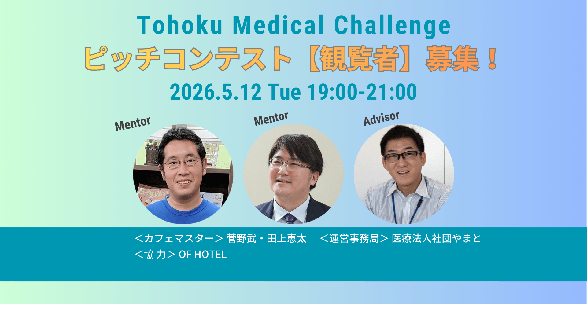 更新日:2026.03.19観覧者募集:5/12(火)開催のピッチコンテスト「Tohoku Medical Challenge」。「地域医療の未来を創りたい」熱い想いを一緒に応援しましょう。詳しくはリンク先をご覧ください。
