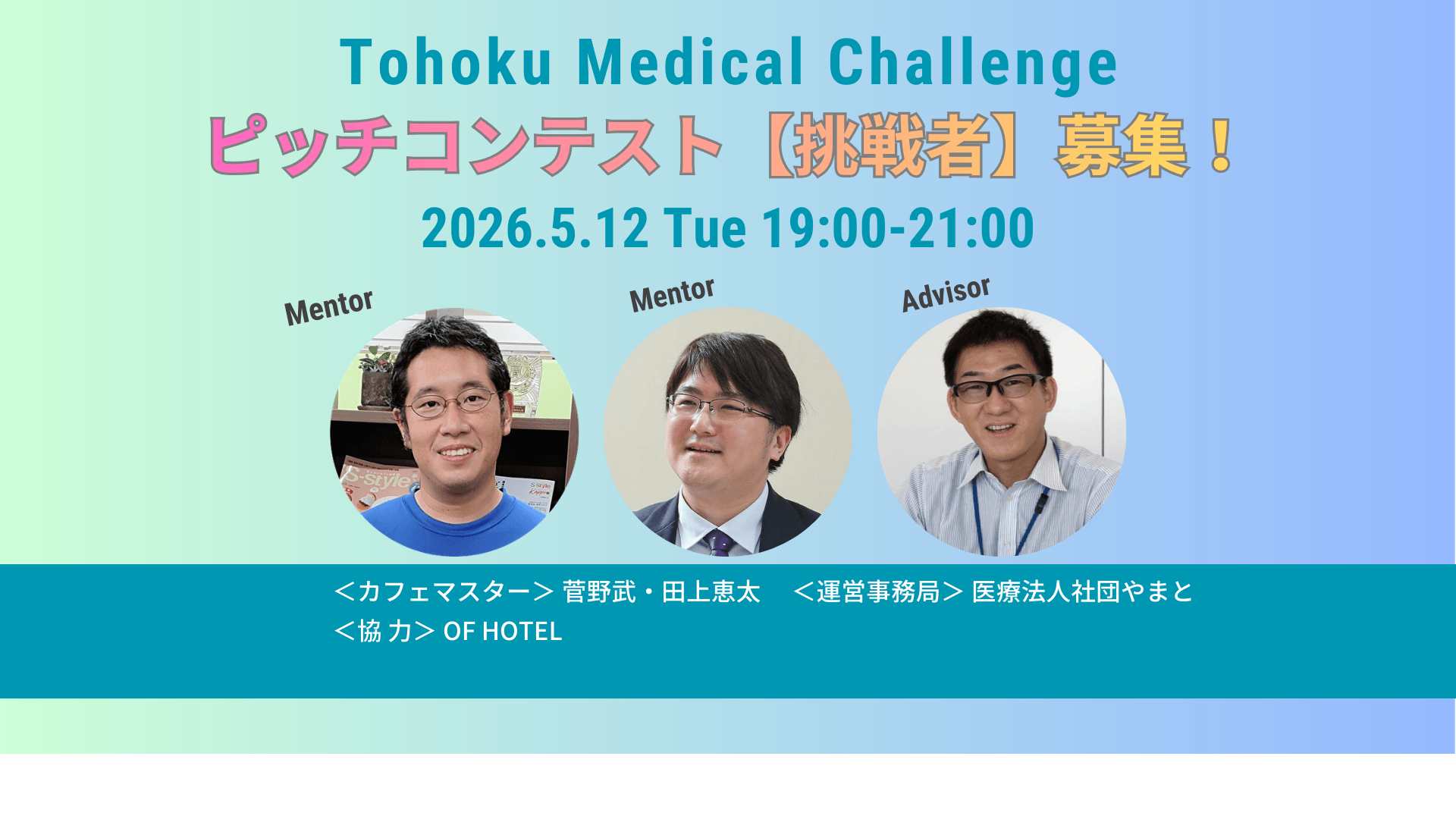 更新日:2026.03.19挑戦者募集:5/12(火)開催のピッチコンテスト「Tohoku Medical Challenge」。地域医療への熱い想いを形にしませんか。詳しくはリンク先をご覧ください。